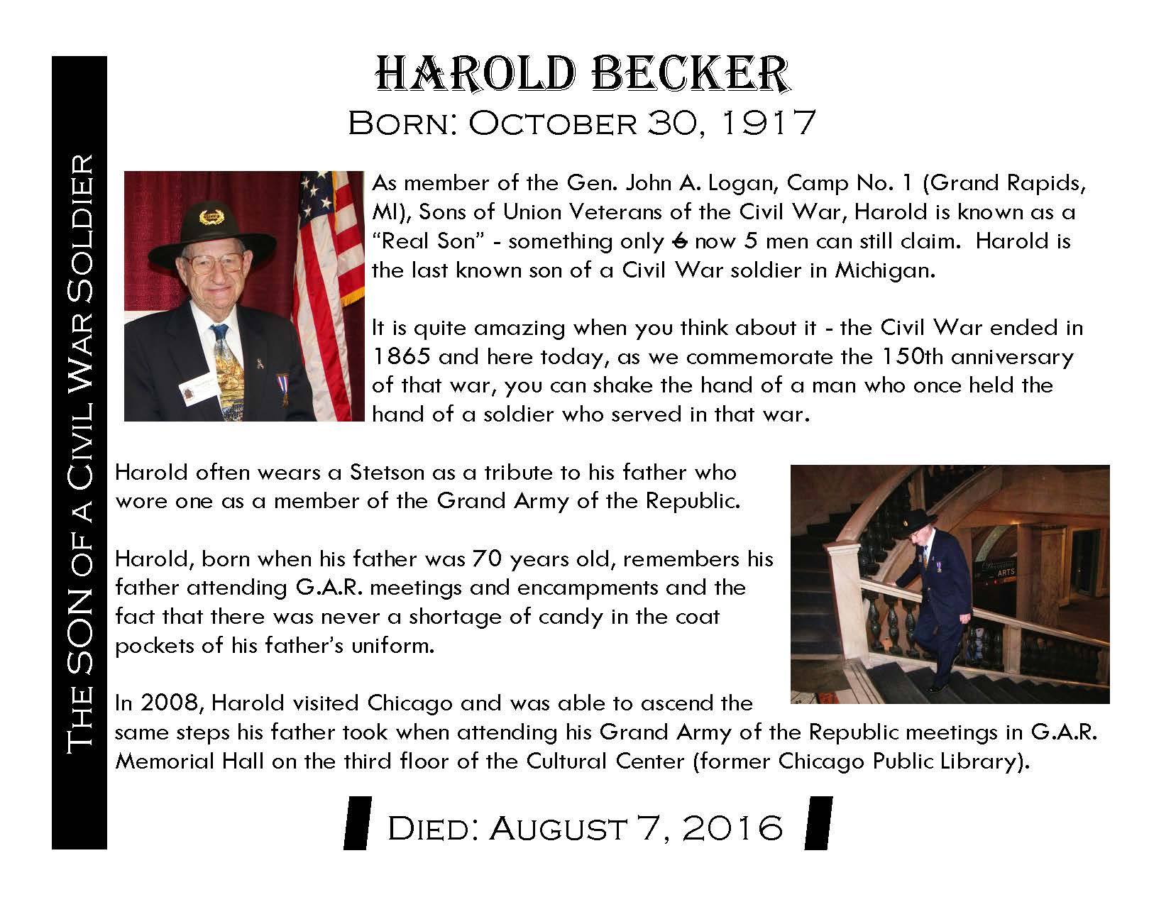 Harold was a member of the Gen. John A. Logan Camp No. 1, Department of Michigan, Sons of Union Veterans of the Civil War. He was known as a Real Son by virtue of the fact his father, Charles Conrad Becker, from St. John, Indiana, served in the Civil War as a Private in Co. H, 128th Indiana Infantry, 1864-1866. Harold was the last Real Son from Michigan. Performing services are members of the Logan Camp No. 1 and Bruce B. Butgereit, Past Department Commander and Comer Skinner, Chaplain. Harold's family would like to offer a special thank you to Marcia and Bruce Butgereit for all of the help and love they have shared over the years. Harold and Dorothy couldn't have asked for better friends.